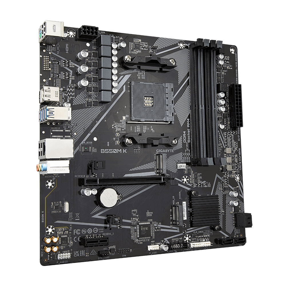 La motherboard Gigabyte B550M K ofrece una plataforma robusta y preparada para procesadores AMD Ryzen de 3ra, 4ta y 5ta generación. Ideal para usuarios que buscan estabilidad, soporte para overclock y expansión futura sin comprometer el presupuesto.