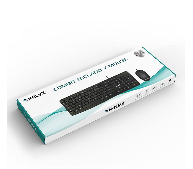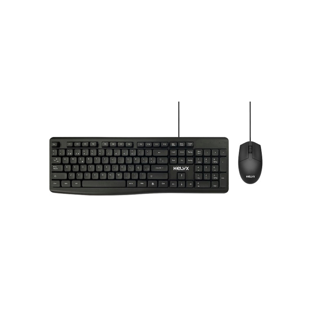 Kit de teclado y mouse Kelyx con conexión USB, ideal para uso diario en oficinas, hogares y entornos educativos. Ofrece buena durabilidad y diseño clásico en color negro.