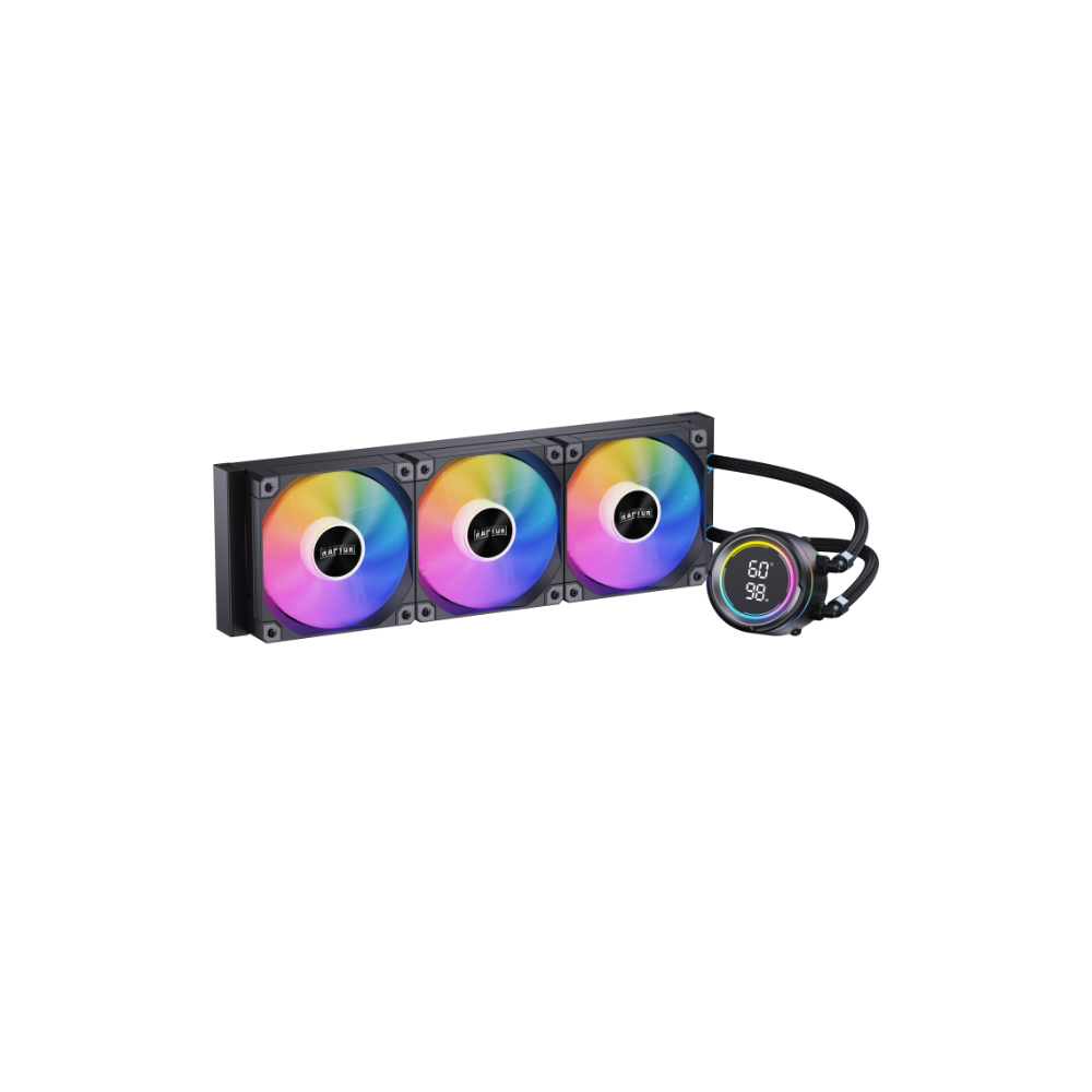 Sistema de refrigeración líquida de alto rendimiento con pantalla digital integrada y triple ventilador RGB. Ideal para equipos de gama alta, combina excelente capacidad térmica, estética moderna y funcionamiento silencioso, manteniendo tu procesador siempre a temperatura óptima.