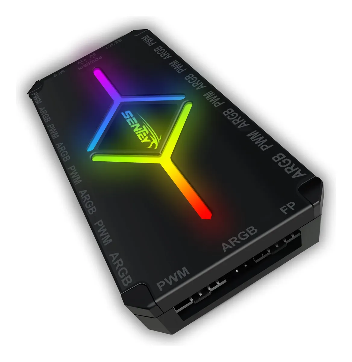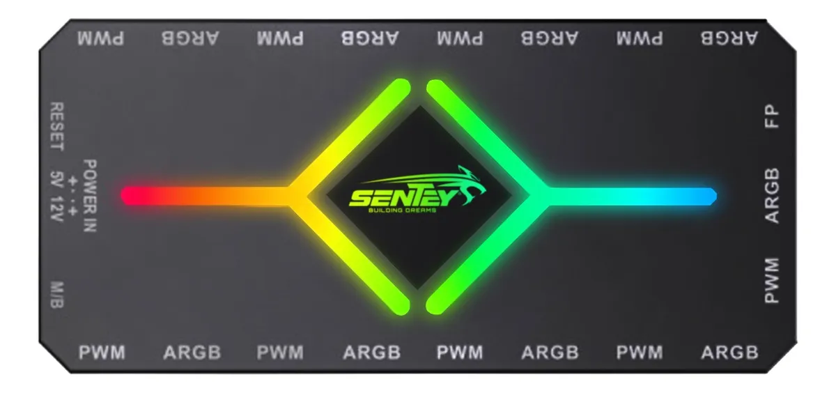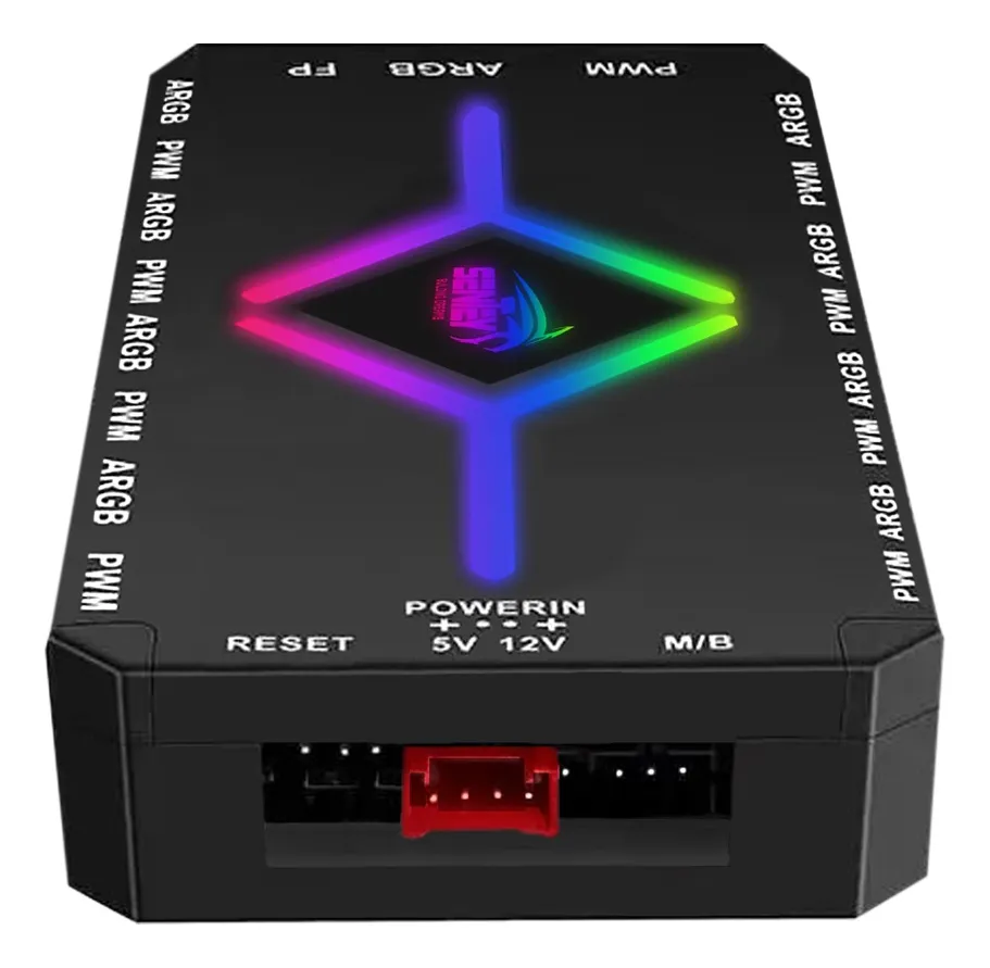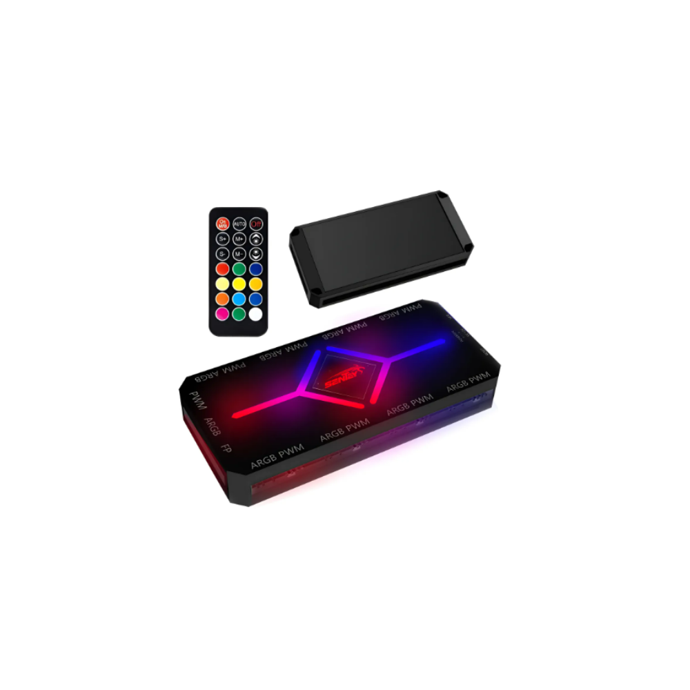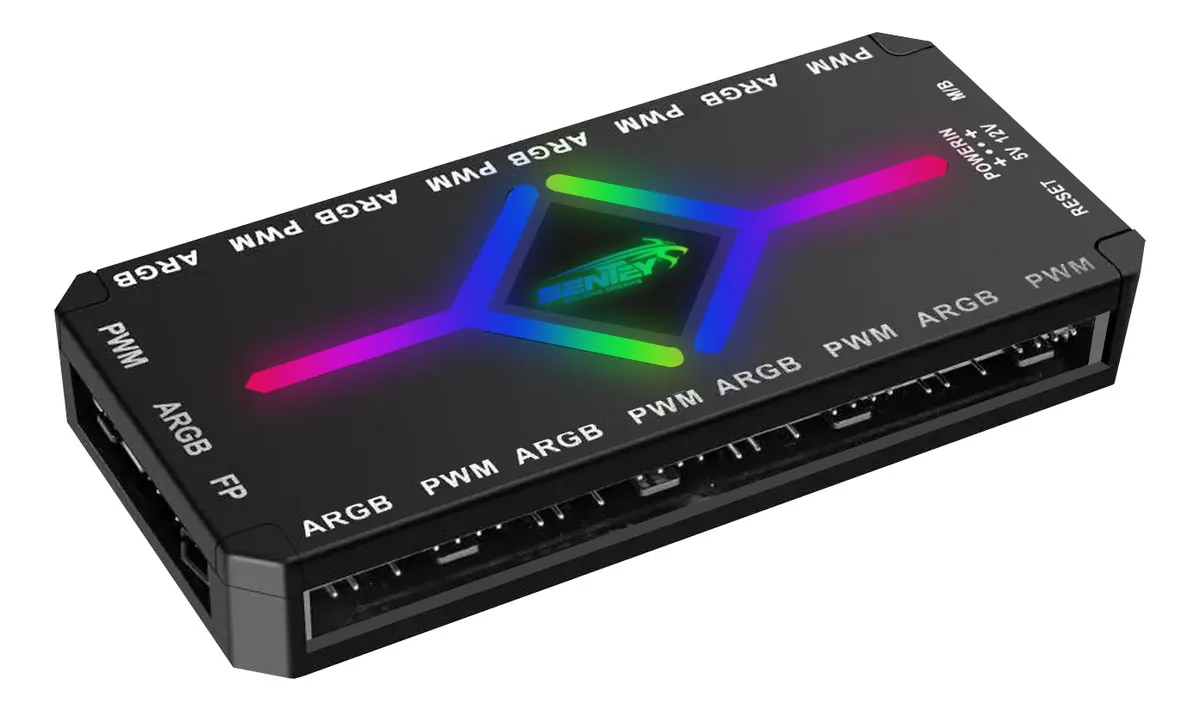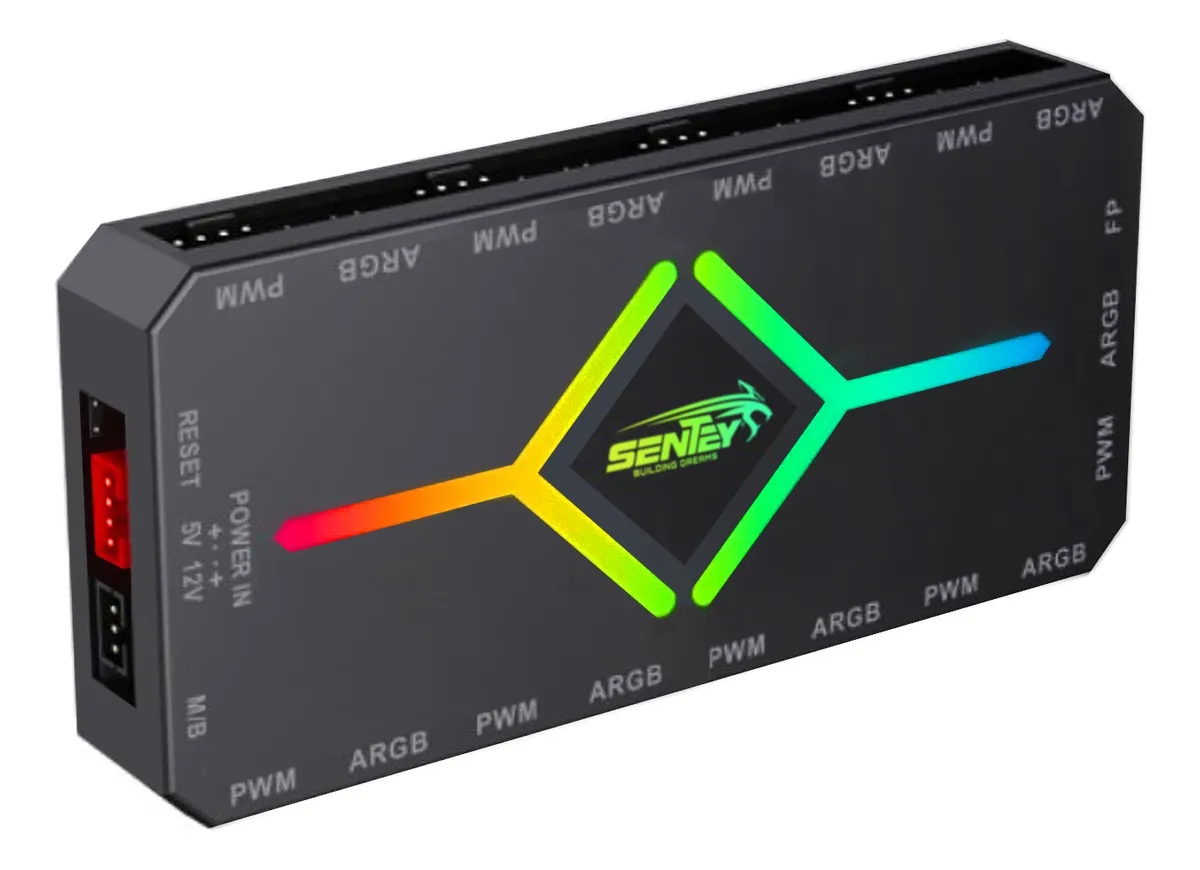 El controlador Sentey de 9 puertos permite administrar ventiladores ARGB y PWM desde un único módulo, facilitando la sincronización de iluminación y la regulación de velocidad. Incluye control remoto para ajustar efectos de luz y comportamiento de los ventiladores, ideal para gabinetes con varios coolers y configuraciones avanzadas de flujo de aire.