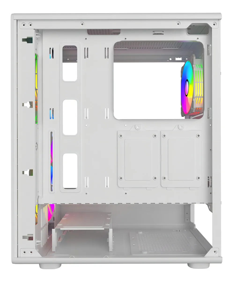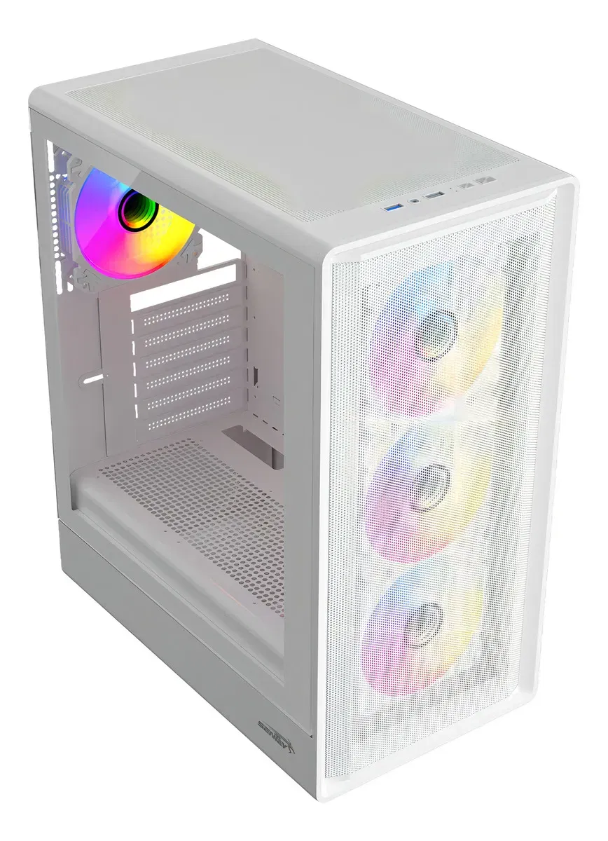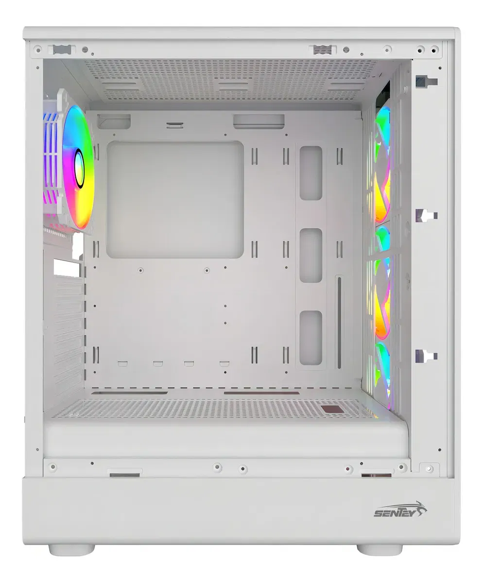 El Sentey M40 White ofrece un diseño actual con panel lateral de vidrio templado y frontal mesh que mejora la ventilación. Sus cuatro ventiladores ARGB aportan iluminación y buen flujo de aire. Es un gabinete Mid Tower compatible con placas ATX y componentes de alto rendimiento, ideal para armados modernos con buen espacio interno y refrigeración eficiente.