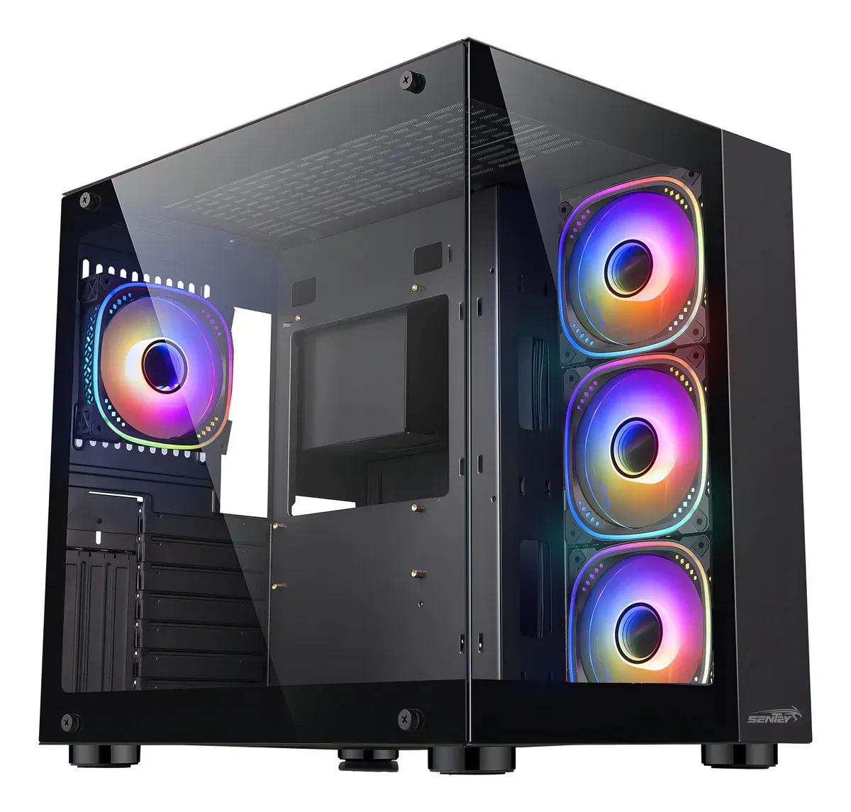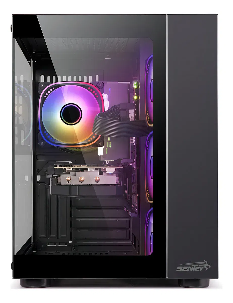 El Sentey A30 Black combina un diseño moderno con panel lateral y frontal de vidrio templado, junto a cuatro ventiladores ARGB con control PWM y control remoto incluido. Es ideal para armados con buena ventilación y estética, compatible con motherboards ATX y componentes de alto rendimiento, ofreciendo un interior amplio y ordenado para configuraciones actuales.